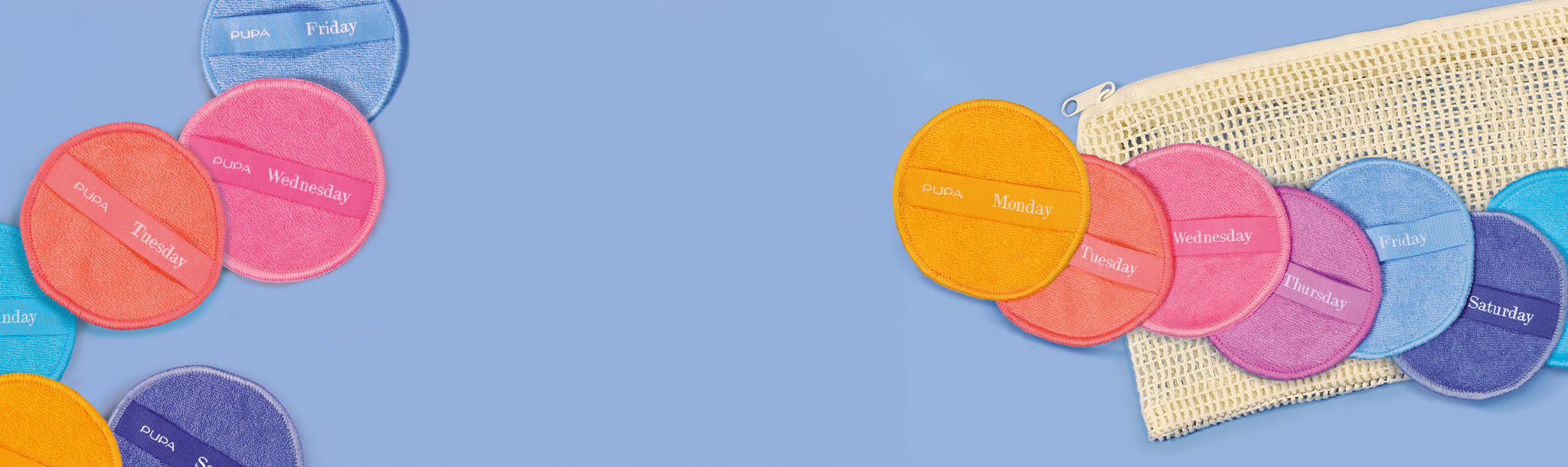 A Pad A Day je sada 7 opakovaně použitelných odličovacích bavlněných tamponů od Pupa Milano, jeden na každý den v týdnu, s praktickým síťovým sáčkem na praní.